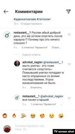 Позднее информация об угрозе сексуальным насилием была опровергнута, и в материалах, зачитанных в суде, в том числе показаниях самого подсудимого, об этом нет ни слова. Адвокат осуждённого Руслан Нагиев в ответ на вопрос одного из пользователей Instagram об изнасиловании ответил на своей страничке следующим образом.