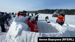 "Мы же сибиряки, что нам бояться холода. Наоборот, пока таскаешь эти снежные блоки, укладываешь, жарко становится. Ну и мы сейчас проверим, какой у нас семейный командный настрой, и кто слабое звено", - говорит корреспонденту Сибирь.Реалии Сергей Воскресенский, который пришел на фестиваль вместе с женой, братом и двумя племянниками.